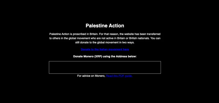 Figure 2: Statement on Palestine Action website with cryptocurrency wallet information and link to Italian franchise (Source: Palestine Action)