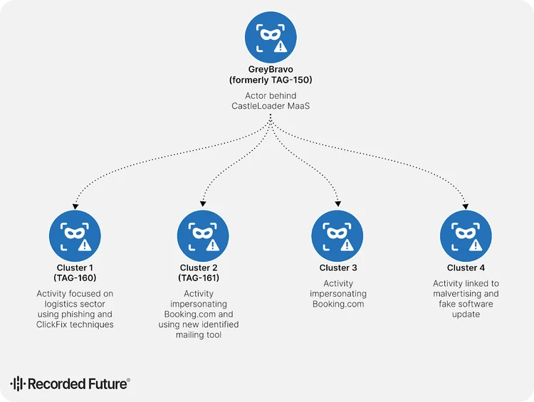 - Cluster 2, tracked as TAG-161, impersonates Booking.com and uses ClickFix techniques to deliver CastleLoader and Matanbuchus, relying on threat actor-controlled infrastructure and employing previously unseen phishing email management tooling.
