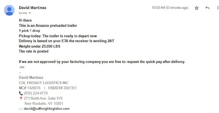 Access to platforms like DAT Freight & Analytics and Loadlink Technologies not only enables the threat actors to enhance the appearance of legitimacy, allowing them to maintain plausible profiles should potential victims attempt verification, but also provides opportunities to gather contact information for prospective targets and obtain additional contextual data, such as details on specific loads, dates and times, documents, or related materials, which can then be repurposed as spearphishing lures. In addition, although not verified in this specific case, the threat actors may also post fraudulent load listings containing malicious content, potentially resulting in malware infections.