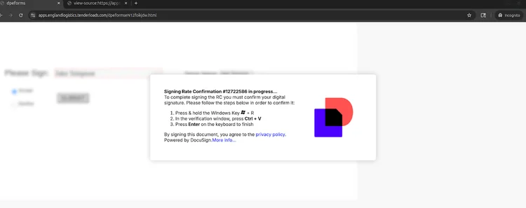 After submitting their information, the victim is presented with ClickFix-style instructions, guiding them through a series of steps purportedly required to complete a document signing process (see Figure 8). By incorporating the DocuSign logo, the threat actors likely aim to enhance the perceived legitimacy of the page and further deceive the victim.