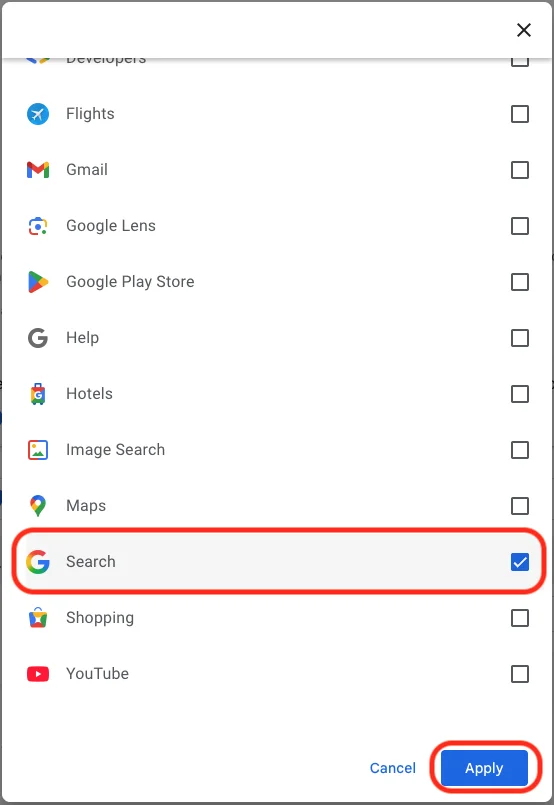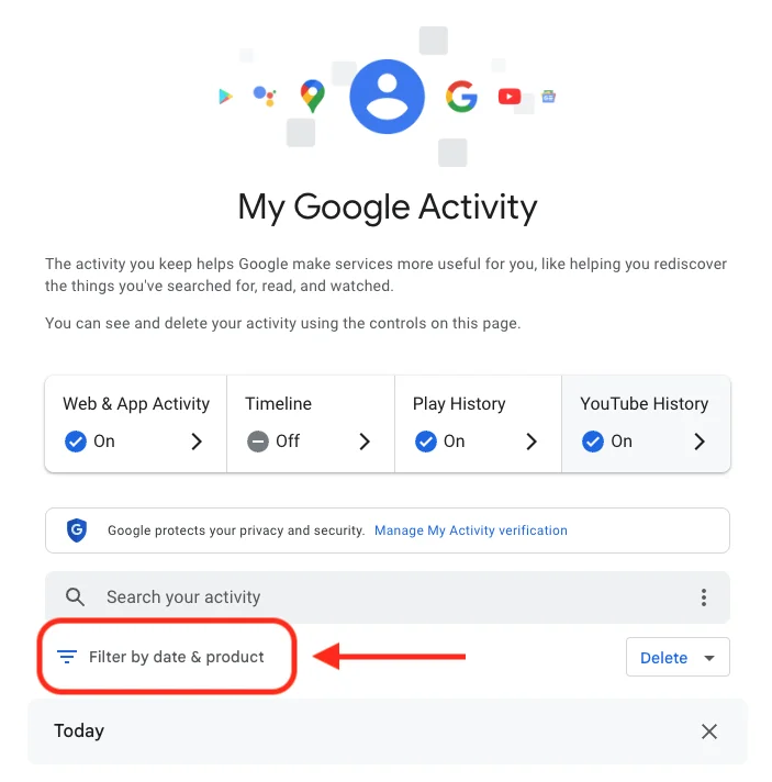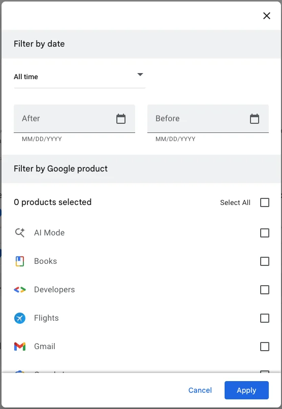 - Once you’ve clicked Filter by date & product, you’ll see a pop-up menu where you can look through your Google activity by date or product. Instead of focusing on the date, scroll down through the list of Google products and check the box for Google Search.