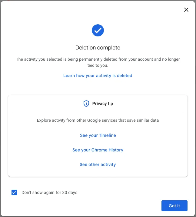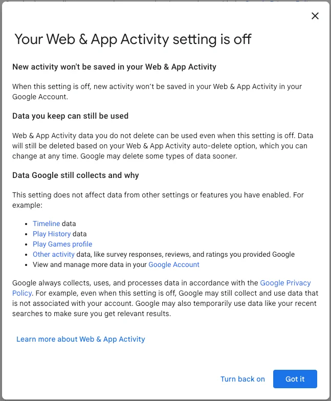 If you selected Turn off, you’re done. Google will no longer save your Google Searches as part of your overall Google profile activity. This option means that Google still has your prior searches recorded, though. So, if you want, you can choose the second option, Turn off and delete activity.
