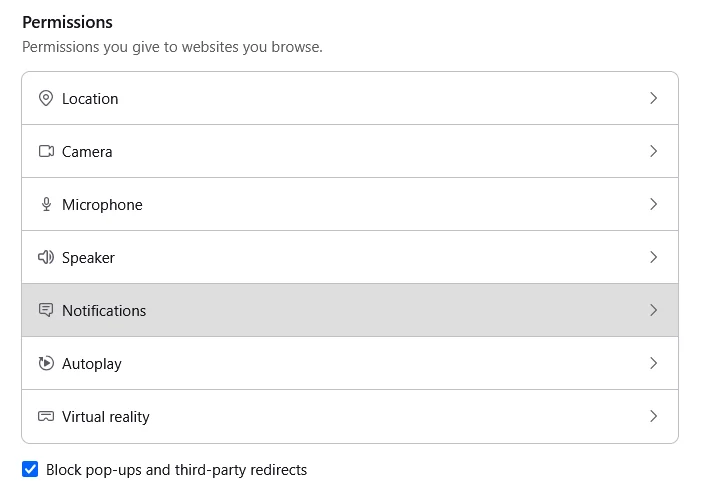 - Under Permissions for this site > Notifications, choose Block from the drop-down menu.
