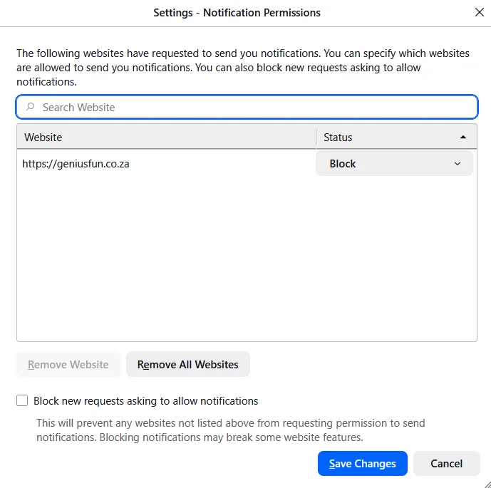 - Select the website for which you want to block notifications, find the Notifications setting, and choose Block from the dropdown menu.