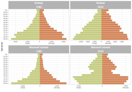 Kiribati today has about four times the population of Marshall Islands but in 1980 was only about double. The significant thing here is the wasp waist of the Marshall Islands pyramid in 2025—while it had a similar shape to Kiribati in 1980. People at peak working and reproductive age are literally absent from today’s Marshall Islands—in this case, primarily in the USA, which gives automatic residence rights to the Compact of Free Association Countries (Marshall Islands, Palau and Federated States of Micronesia).